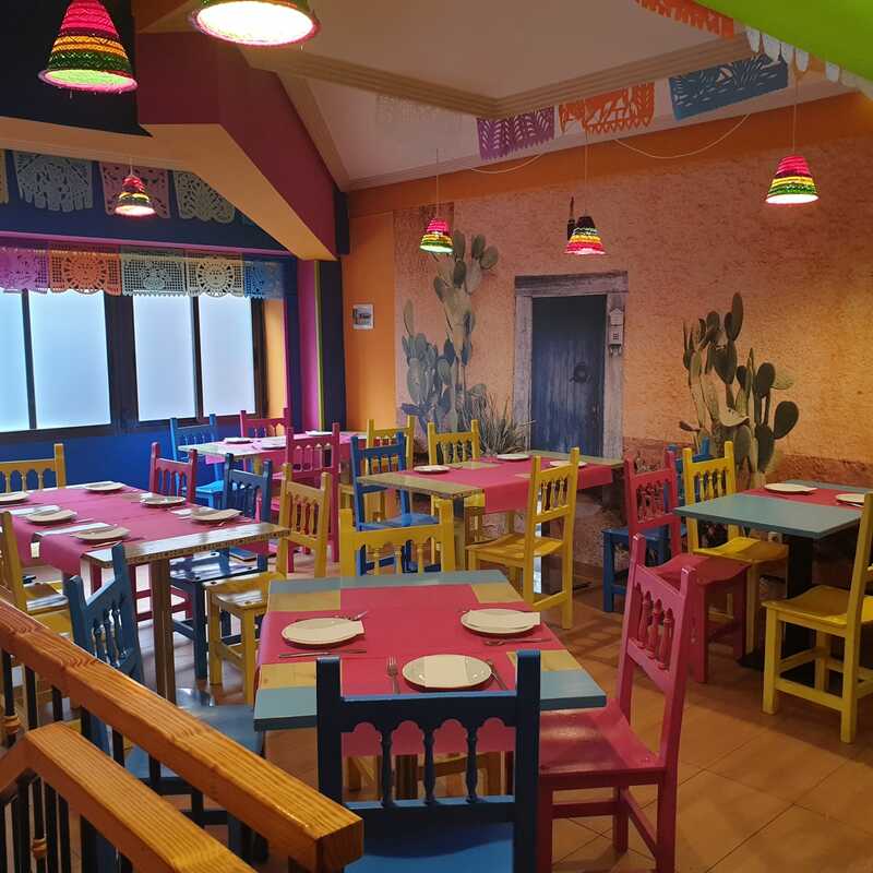 Platos populares servidos en un lugar que recrea espacios rústicos y coloridos de México